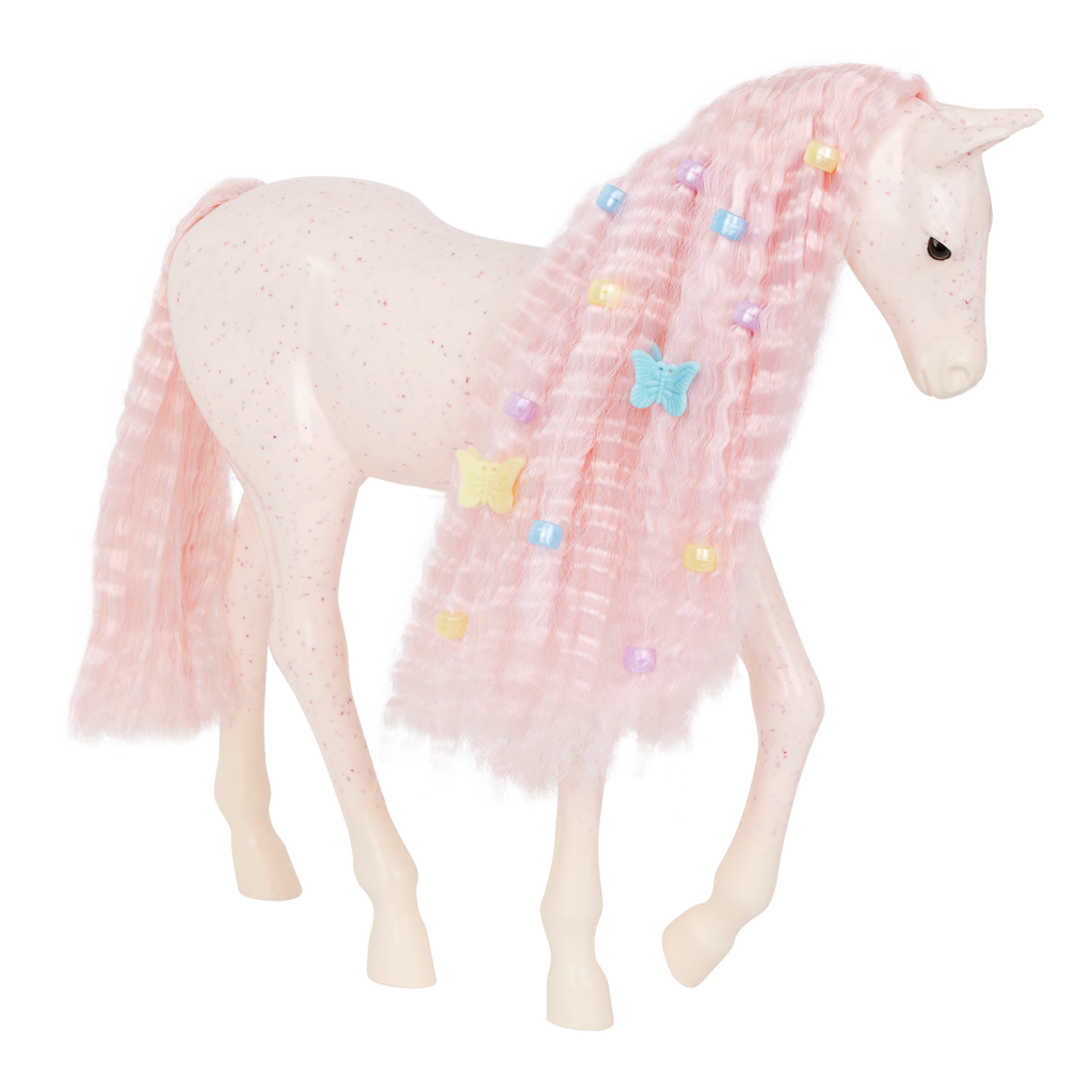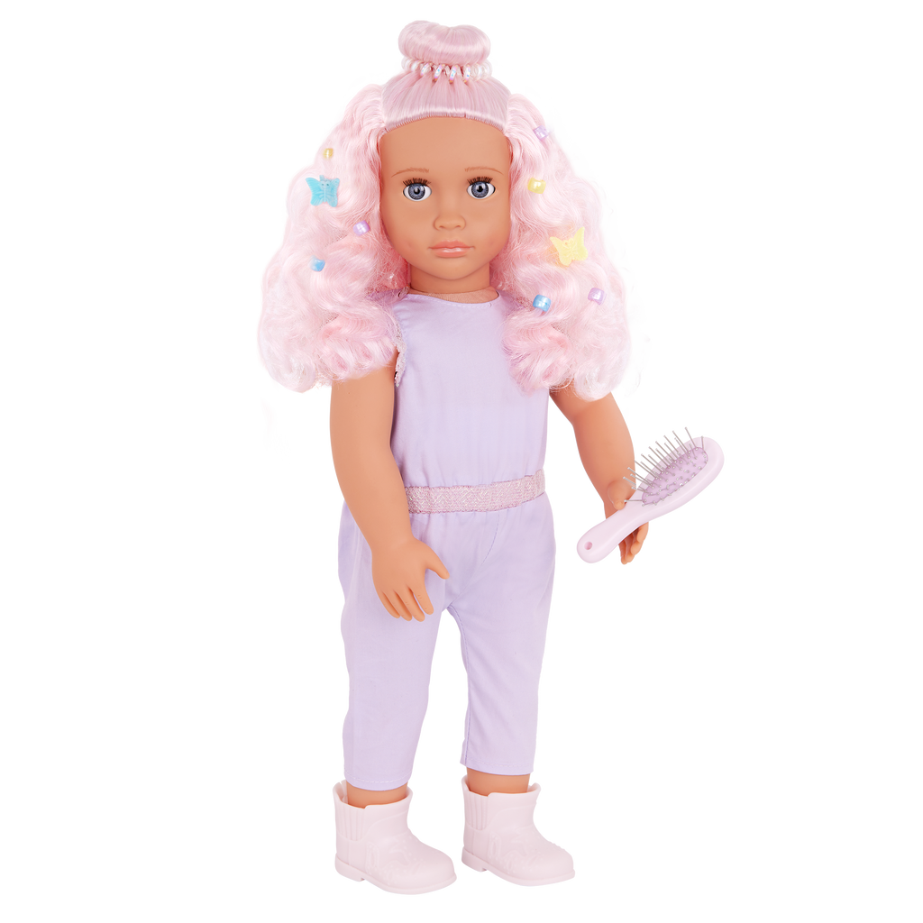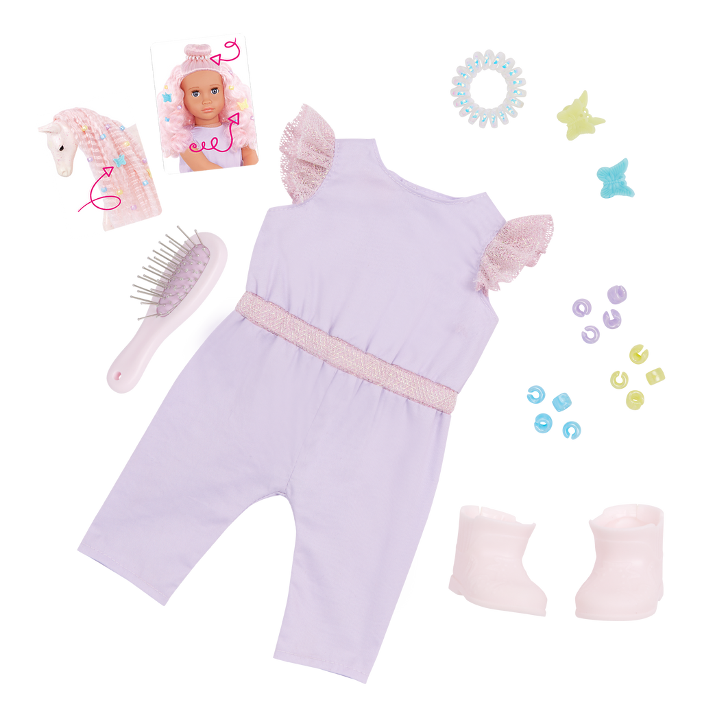 Galopes, risos e glamour! A nossa boneca Generation Elara e o potro Lumina chegam com o cabelo cor-de-rosa a condizer para entrançar, pentear e decorar em cada passeio. Transforme cada look com a escova de cabelo, o elástico de cabelo em espiral, 12 contas de cabelo coloridas e 2 ganchos de garra de borboleta para uma diversão encantadora. Além disso, os pequenos estilistas podem usar os 2 cartões de estilo para dar asas à sua imaginação! A Elara tem um corpo macio e confortável, olhos azul-acinzentados que se abrem e fecham e covinhas bonitas para encantar os fãs da boneca durante as brincadeiras. Quando chega a altura de se vestir, a sua elegante camisola lilás tem fechos fáceis de abrir para vestir e tirar rapidamente. Assim, as crianças podem misturar, combinar e criar combinações ainda mais giras! As nossas bonecas Generation são um ótimo presente para crianças a partir dos 3 anos (peças pequenas), encorajando-as a criar as suas próprias histórias.